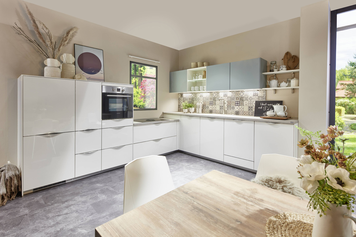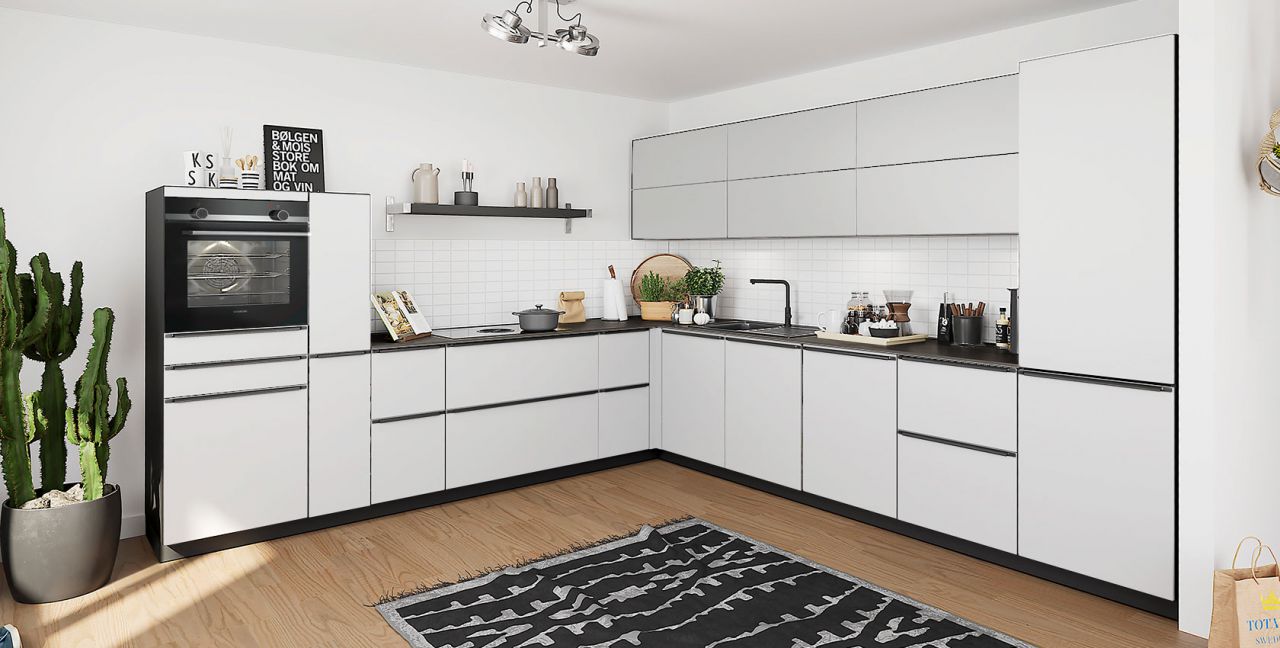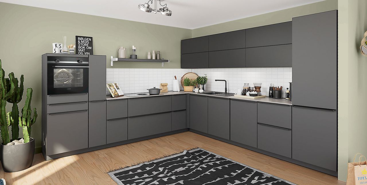 Inklusive Einbaubackofen in Schwarz / Edelstahl Siemens HB517GBS3 Energieeffizienzklasse A+, Glaskeramik Kochfeld mit Induktion und Kochfeldabzug (Umluft) Bora GP4U, Kühlschrank Progress PK0814 Energieeffizienzklasse E, Einbau-Designspüle Elleci Logik 300, XL-Schränken, Unterschränken mit Großraumauszügen, Wandschränken mit Falt-Lifttür, Apothekerschrank.