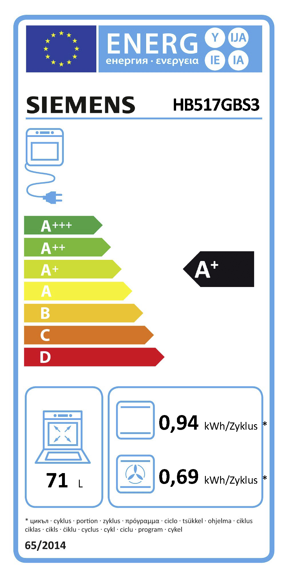 Energieeffizienzklassen und Spektren: Backöfen, Herde und Dunstabzüge A+++ - D, Geschirrspüler und Kühl-/Gefrierschränke A - G.